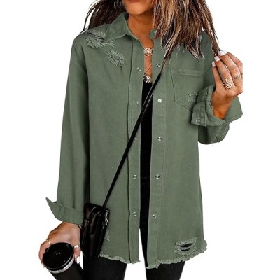 Women's Oversized Denim Jacket Casual Long Sleeve Denim Shirts Distresse Jean Jacket 2025 Spring Outfits