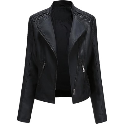 Women's Faux Leather Moto Jacket Casual Short Solid Color PU Biker Coat with Pockets