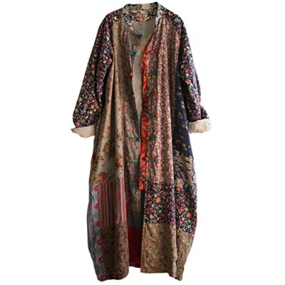 Women's Trench Coat Cotton Linen Floral Print Jacket Chinese Style Patchwork Outwear