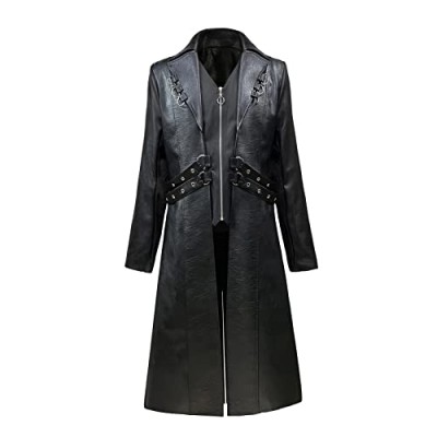 Men's Faux Leather Motorcycle Trench Coat Black Long Punk Jacket