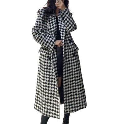 Women's Houndstooth Trench Coat Notch Lapel Double Breasted Quilted Lined Long Jacket Overcoat Pea Coat