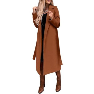 Womens Long Wool Pea Coats Notched Collar Open Front Woolen Blend Trench Coat with Belt