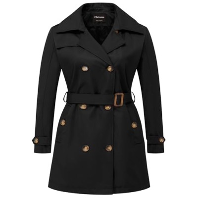 Women's Plus Size Double Breasted Trench Coats Mid-Length Belted Overcoat Dress Jacket with Detachable Hood