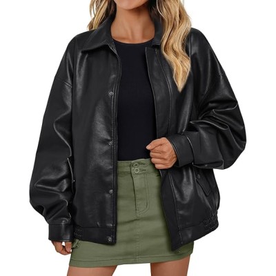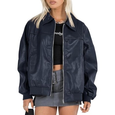 Womens Faux Leather Jackets Oversized Bomber Casual Fall Fashion Zip Up Moto Biker Coats