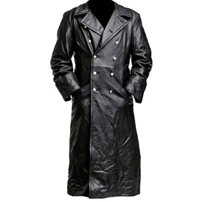 Mens Double Breasted Black Leather Trench Coat - Military Officer Uniform Vintage Black Jacket Coat Men
